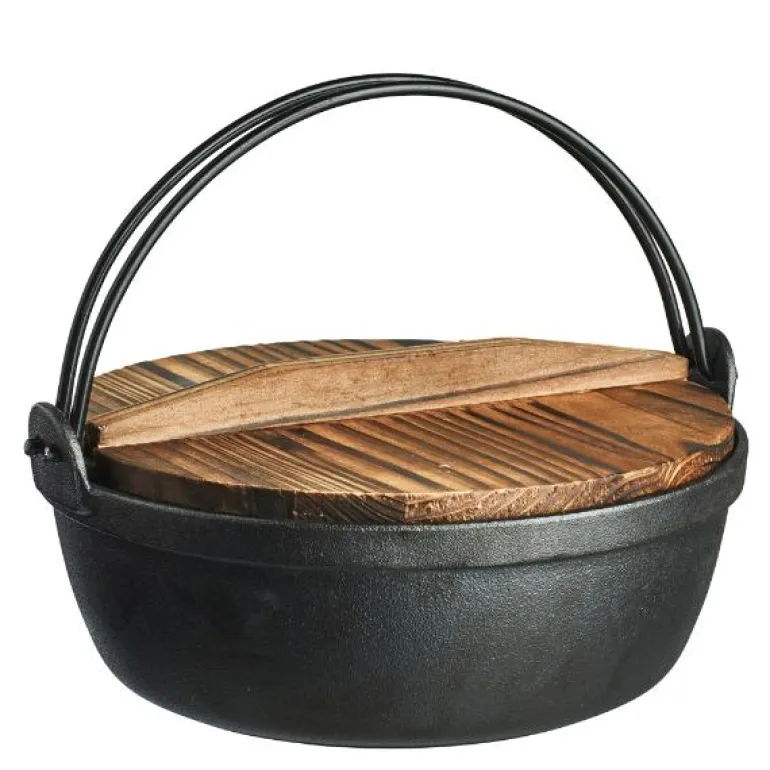 Støpejernsgryte med glasslokk og trelokk fra Satake.