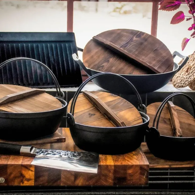 Satakes nye serie med gryter i ulike størrelser leveres med doble lokk. En praktisk og ovnssikker glasslokk (tåler varme opp til 220°C) og et vakkert trelokk med håndtak for servering.