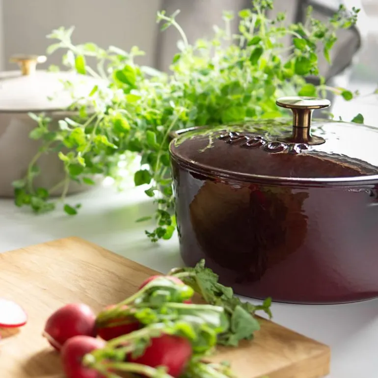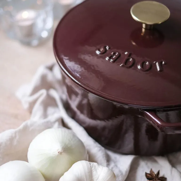 Støpejernsgryte i lekker zinfandel farge, fra Sabor. Gryten rommer 4,4 liter, og er toppet med gullfarget knott.