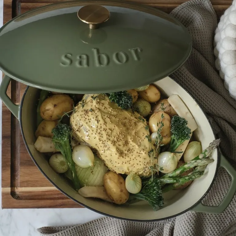 Denne elegante støpejernsgryten fra Sabor, med en kapasitet på 5,7 liter og en vakker olivenfarge, kombinerer tidløs design med enestående funksjonalitet. Grytens robuste konstruksjon sikrer at den kan gå i arv gjennom generasjoner, mens dens evne til å holde og fordele varmen jevnt gjør den til et uunnværlig verktøy på kjøkkenet. Med denne gryten kan du ofte redusere varmen på platen betraktelig, noe som gir både energibesparelser og jevn matlaging.