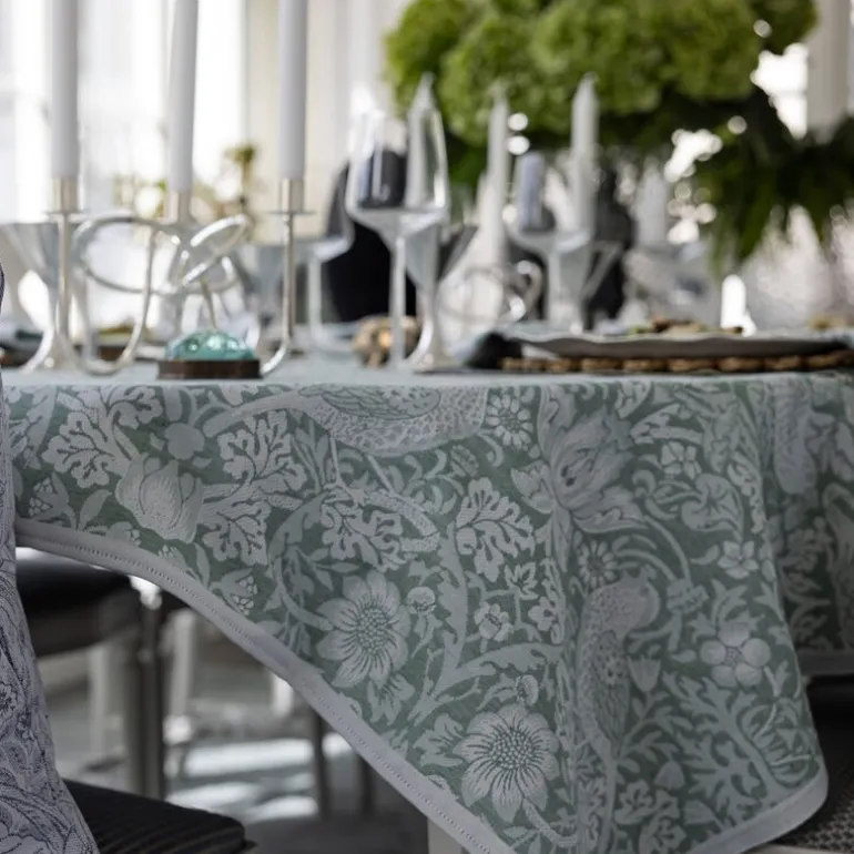 Strawberry Thief duk 150×150 cm grønn fra Ekelund X William Morris er en elegant og dekorativ duk som tilfører borddekkingen et kunstnerisk og tidløst preg. Inspirert av William Morris’ ikoniske Strawberry Thief-mønster, kjennetegnes denne duken av intrikate detaljer med fugler og blomster i en harmonisk grønn fargetone.