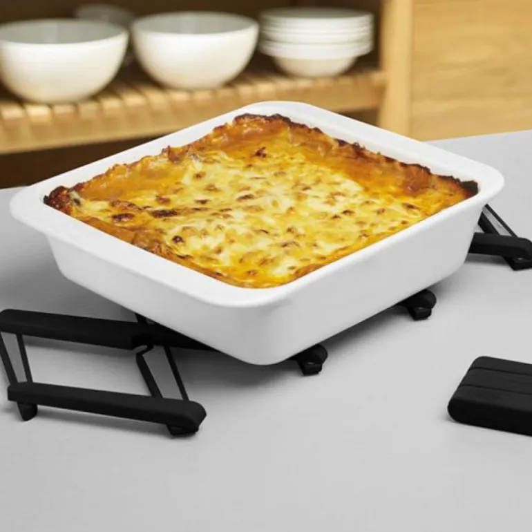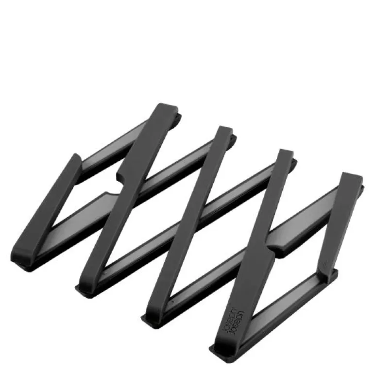 Svart bordskåner, Stretch fra Joseph Joseph. En genial bordskåner som en kan tilpasse inntil flere gryter. Etter bruk foldes den fint sammen og tar liten oppbevaringsplass. Den er 20 cm lang, 5 cm bred og 1,5 cm høy. Utslått er den 60 cm lang. Laget av silikon og nylon. Tåler vask i oppvaskmaskin.