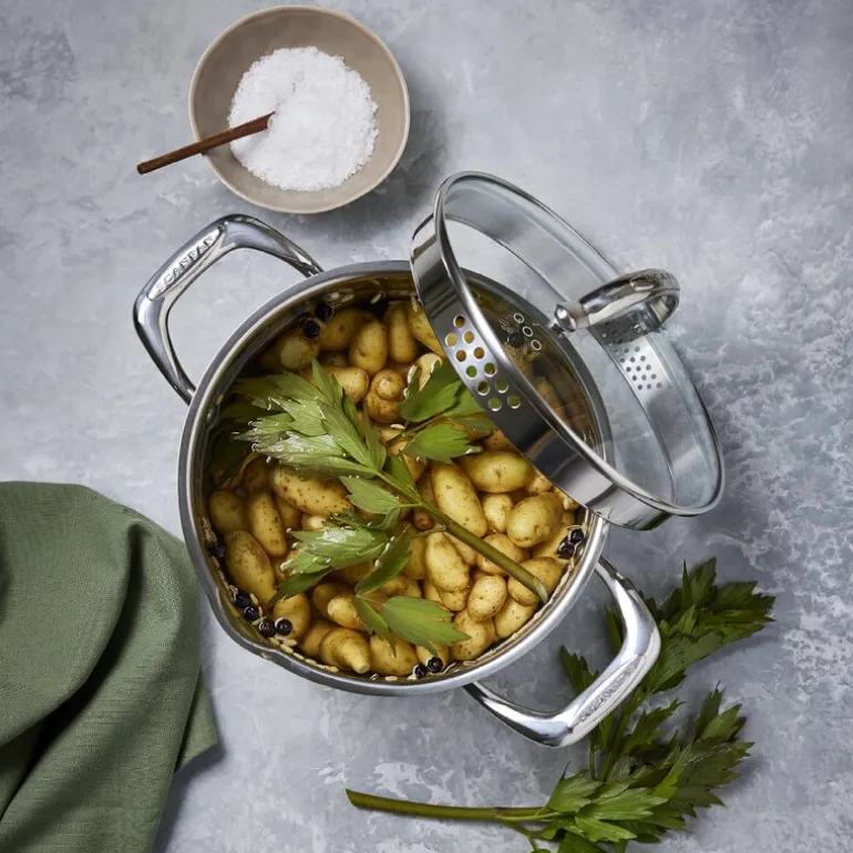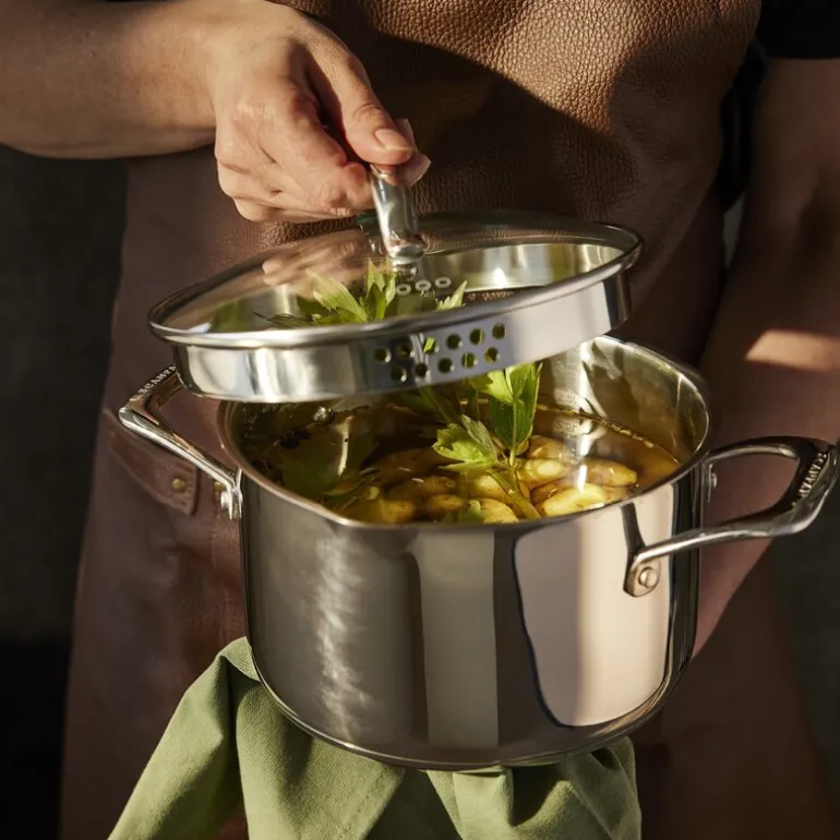 Gryten er utstyrt med smarte detaljer som et integrert dren i lokket og en helletut som gjør det enkelt å helle uten søl. Innsiden har en praktisk måleenhet, som hjelper deg med presis matlaging. Bunnen er avrundet og består av rustfritt stål med en aluminiumskjerne, noe som sikrer rask og jevn varmefordeling. Dette gjør gryten til et pålitelig redskap for alt fra små til store kokkeprosjekter. STS-serien setter en ny standard for design av gryter og panner, både når det gjelder estetikk og funksjonalitet. Med sitt elegante, blanke stål og myke, runde former, er disse produktene umulige å glemme etter første øyekast. Når du først har brukt dem, blir de uunnværlige på kjøkkenet.