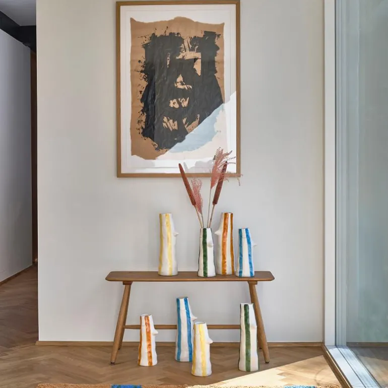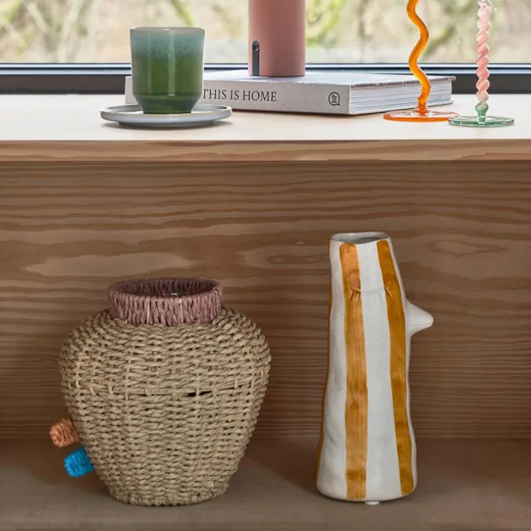 Fin vase av steintøy, med nebb og øyevipper. Den lyse vasen er dekorert med håndmalte brune striper. Vasen sprer god stemning med sitt humoristiske uttrykk og sine livsbejaende farger. Høyde: 34 cm.