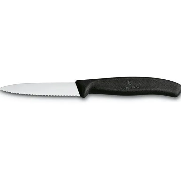 Victorinox grønnsakskniv 8 cm med bølget egg i rustfritt stål med sort plastskaft. Liten grønnsakskniv med spiss tupp som passer ypperlig til de små kutte og skjære jobbene.Victorinox er et gammelt kvalitetsmerke på kniver fra Sveits.Det begynte med de verdensberømte Swiss Army Knives og produserte etterhvert kniver både til profesjonellt bruk og til hobby kokker.Victorinox har fokus på kvalitet, innovasjon og tradisjon.I de senere år også produserer de i tillegg andre produkter som klokker, reiseartikler og dufter.