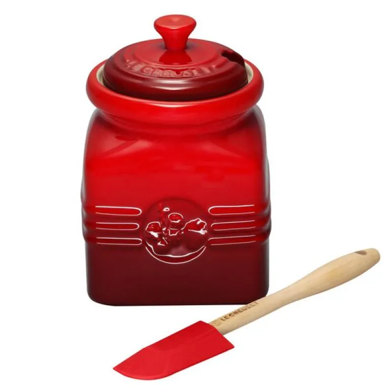 Le Creuset sin klassiske syltetøykrukke med spatel kombinerer funksjonalitet og eleganse, og er perfekt til både oppbevaring og servering av syltetøy, marmelade, gelé og chutneyer. Laget av solid stentøy av høyeste kvalitet, er krukken designet for å tåle daglig bruk og har en tidløs estetikk som passer på ethvert frokost- eller middagsbord.