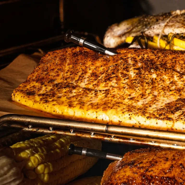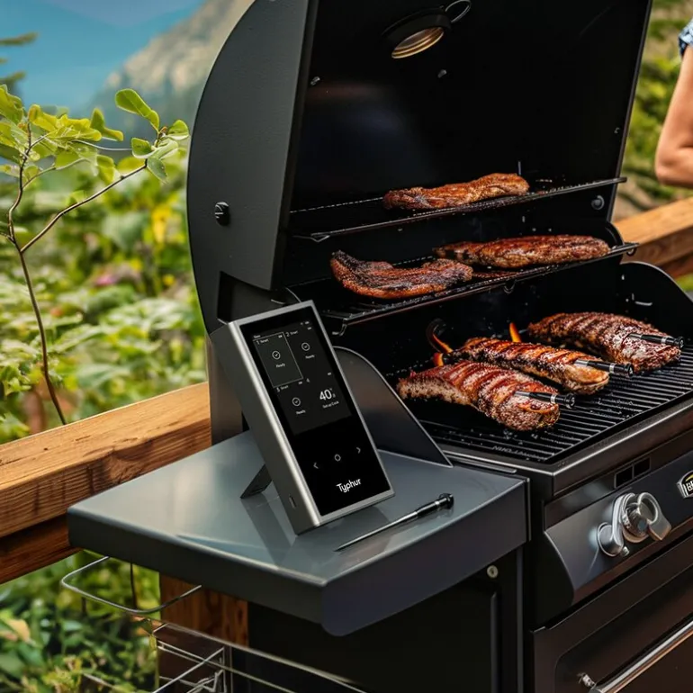 I esken følger basestasjon, fire prober, USB-C ladekabel og brukerveiledning. Typhur-appen gir tilgang til temperaturvarsler, oppskriftsveiledning og smart matlagingskontroll – alt rett på mobilen.