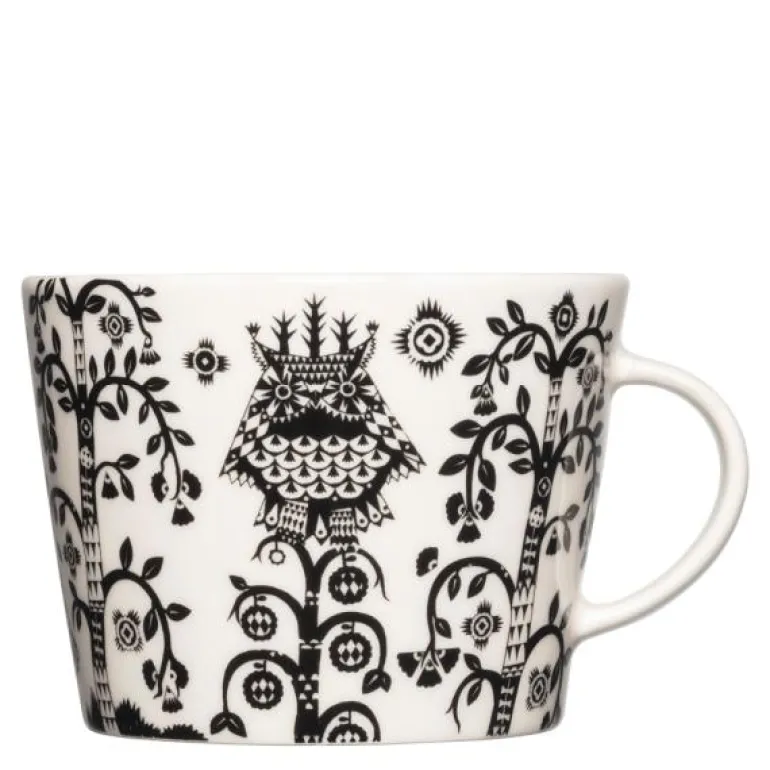 Taika kopp 30 cl svart fra Iittala. Designer Klaus Haapaniemis kunst og Heikki Orvolas stilige design kombineres på en unik måte i Taika-koppen på 0,3 l. Passer med 16 cm skål. Størrelsen på 0,3 l er perfekt for alle varme drikker. Detaljrikdommen i det sorte mønsteret fremheves vakkert mot koppens hvite bakgrunn.