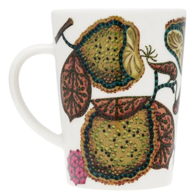 Taika Sato-kruset fra Iittala i gult med rosa detaljer er et elegant valg for varme drikker. Med en kapasitet på 30 cl kombinerer det Heikki Orvolas tidløse design med Klaus Haapaniemis livlige illustrasjoner inspirert av stilleben. De detaljerte mønstrene av frukt og grønnsaker gir kruset et unikt og kunstnerisk uttrykk. En perfekt gaveidé eller et stilig tillegg til ditt servise.