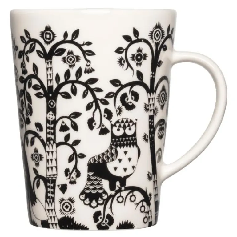 Taika krus 30 cl svart fra Iittala. 0,3 l Taika-kruset er det perfekte valget for både varme og kalde drikker. Kruset kombinerer Klaus Haapaniemis kunst med Heikki Orvolas stilige design. Krusets hvite bakgrunn fremhever de rike detaljene i det svarte uglemotivet. Kombinér deler i forskjellige farger for å skape en effektfull helhet. En utmerket gave.