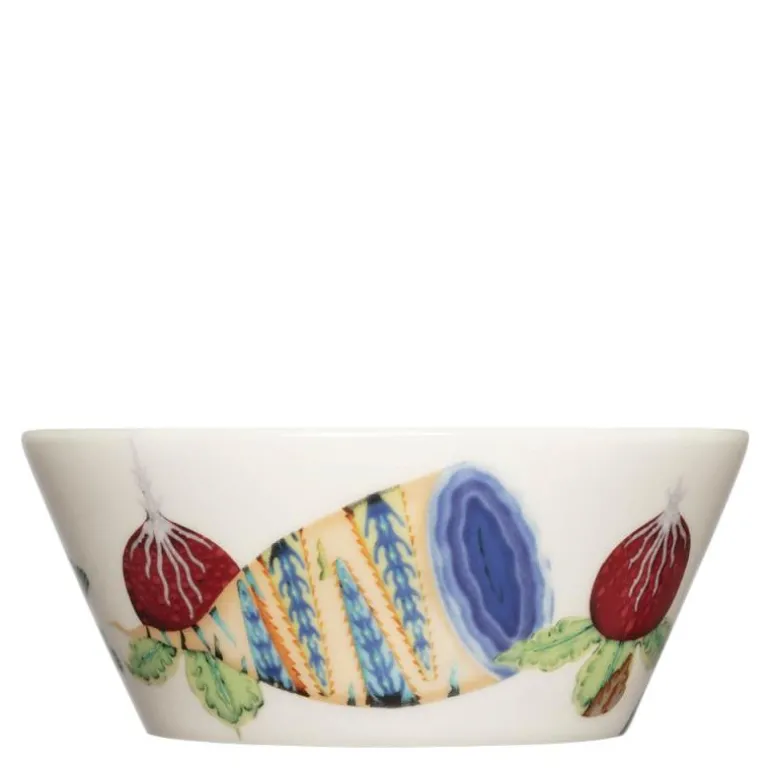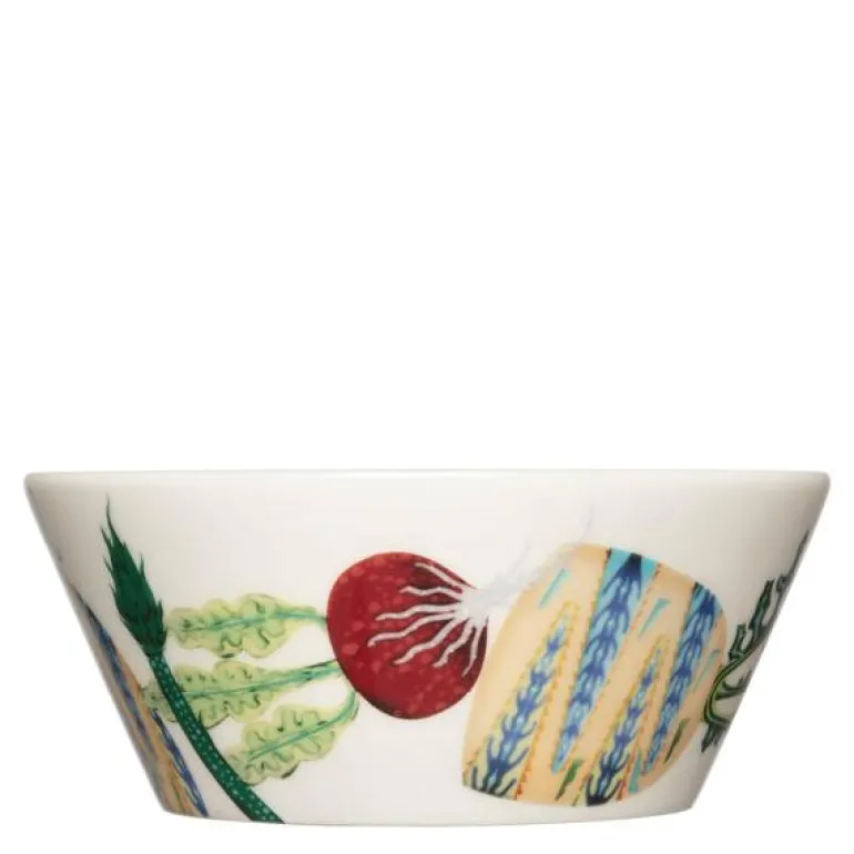 Taika Sato kombinerer Klaus Haapaniemis livlige illustrasjoner med Heikki Orvolas funksjonelle former, noe som resulterer i en unik blanding av dekorativt og funksjonelt design. Inspirert av stillebenkunst, har kolleksjonen levende mønstre av fortryllende frukt og grønnsaker. Skålen på 0,3 L er perfekt til frokost, desserter og sauser.