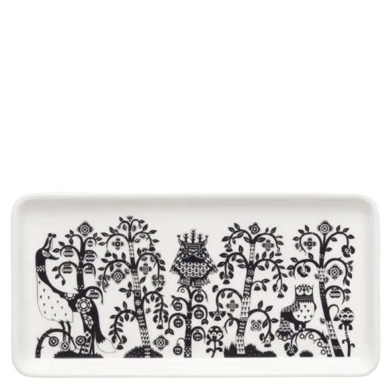 Taika tallerken rektangel 12×24 cm svart fra Iittala. Den rektangulære 12×24 cm Taika-tallerkenen egner seg til servering og er en vakker pyntegjenstand. Tallerkenen kombinerer Klaus Haapaniemis fascinerende illustrasjoner med Heikki Orvolas nedstrippede former. Den allsidige tallerkenen er også et dekorativt objekt hvor små skatter kan oppbevares på en vakker måte. En utmerket gaveide.