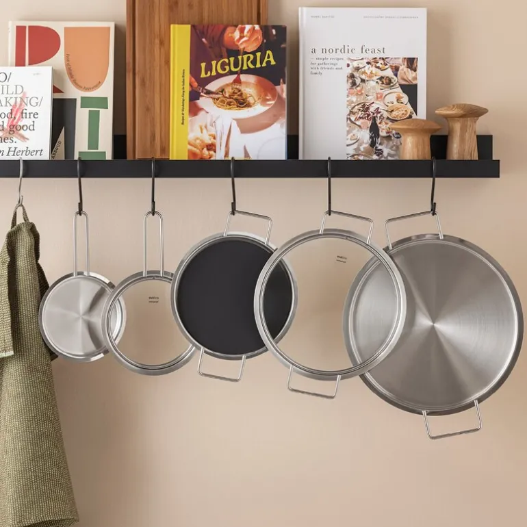 Eva Trios tallerkenlokk 24 cm i rustfritt stål er en smart løsning med fokus på funksjonalitet. Det lange håndtaket gjør det trygt og enkelt å løfte lokket, slik at du kan sjekke maten uten å risikere dampforbrenninger. Lokket kan både stables eller henges opp, avhengig av oppbevaringsbehovet ditt.