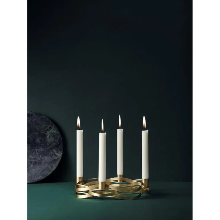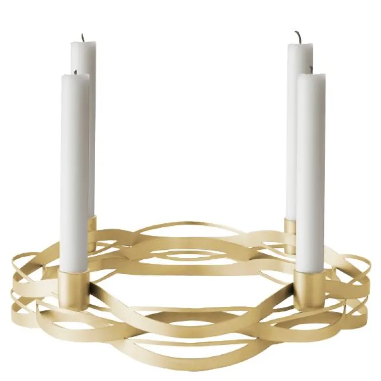 Lysestake i vakker børstet messing og har plass til fire kronelys av vanlig størrelse, og har en diameter på ca. 26 cm.