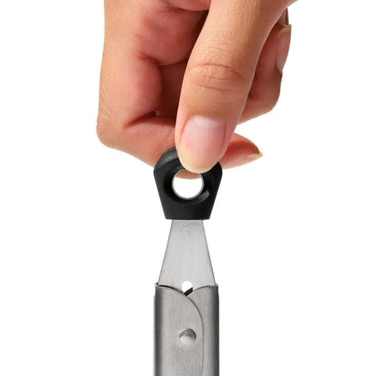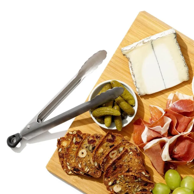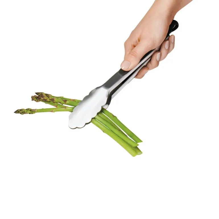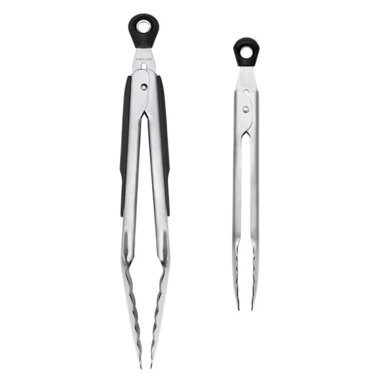 Tangsett fra OXO i børstet, rustfritt stål og svart gummi består av to praktiske kjøkkenredskaper: en stor klype på 23 cm og en mindre tang på ca. 17,5 cm. Den store tangen har et komfortabelt non-slip-grep i myk gummi for godt feste.