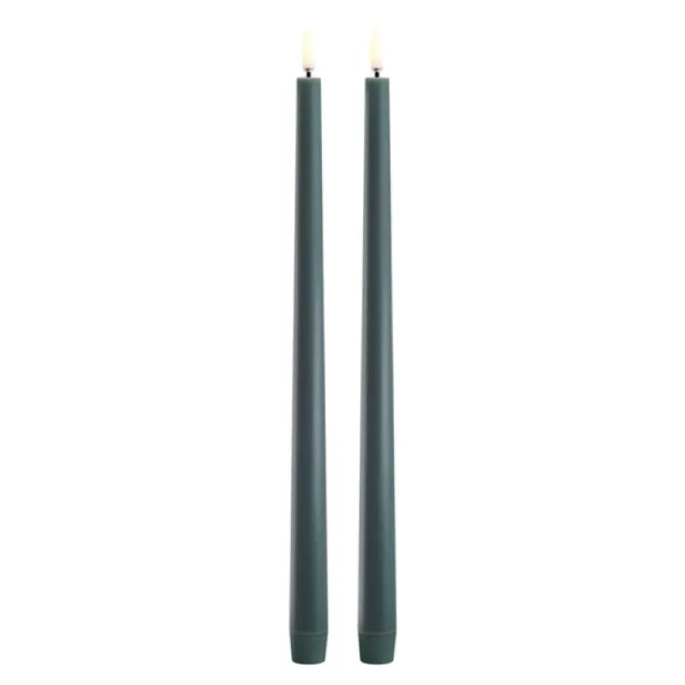 To stykk Taper Candles LED-kronelys i en lekker mørk grønn farge fra Uyuni Lighting. Settet med de slanke kronelysene har en realistisk 3D-flamme som gir en autentisk følelse uten de typiske utfordringene ved vanlige stearinlys. Med disse lysene får du den varme atmosfæren fra levende lys, samtidig som de er laget av parafinvoks med LED-teknologi, noe som gjør dem tryggere å bruke innendørs. Den patenterte 3D-flammen er spesielt designet for å etterligne utseendet til ekte flammer, uten å skape farer som sot eller skadelige stoffer. Lysene er perfekte for hjem med små barn eller kjæledyr, da de ikke utgjør noen brannrisiko.