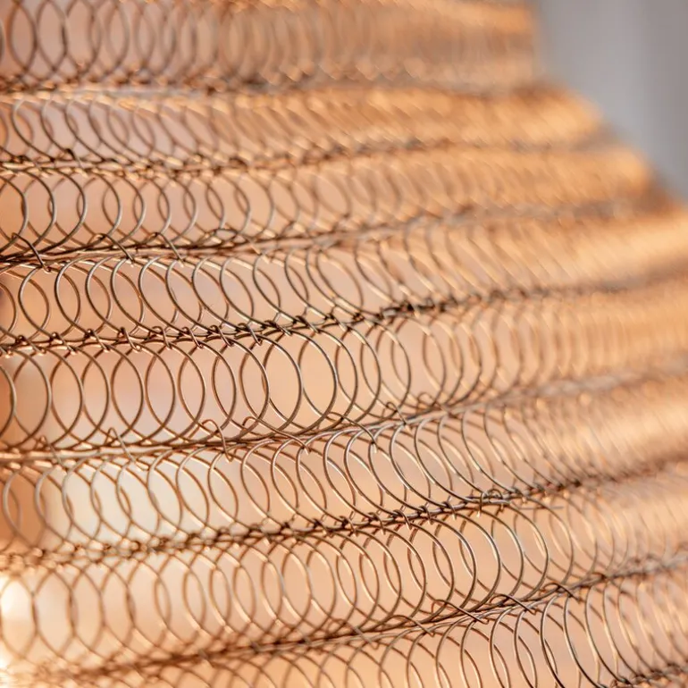 Tazza taklampe 50 cm fra Markslöjd i gull er en unik lampe i gullfarget metall, med en form inspirert av naturens bikuber. Den organiske, rustikke formen gir lampen et dynamisk og skulpturelt utseende, perfekt for å tilføre rommet en spennende visuell dimensjon. Den åpne strukturen gir også interessante lyseffekter som skaper en unik atmosfære.