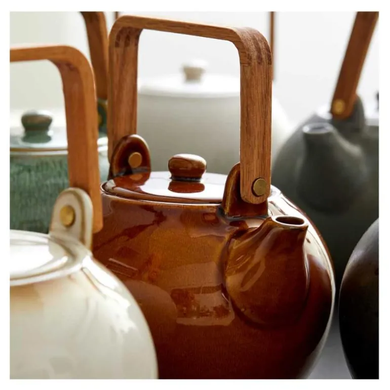 BITZ Tekanne rommer 1,2 liter, og er laget i robust steintøy med en flott, reaktiv glasur, og den er utstyrt med et rustikt håndtak av eik med messingnagler. Brygg yndlingsteen din, server den rykende varm og la kosen spre seg.