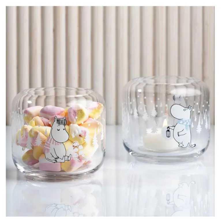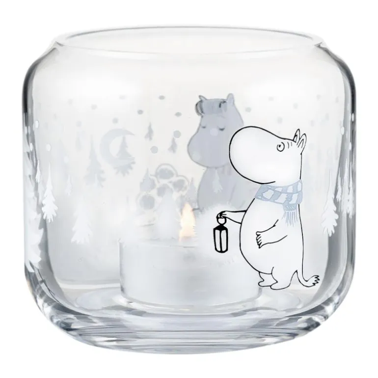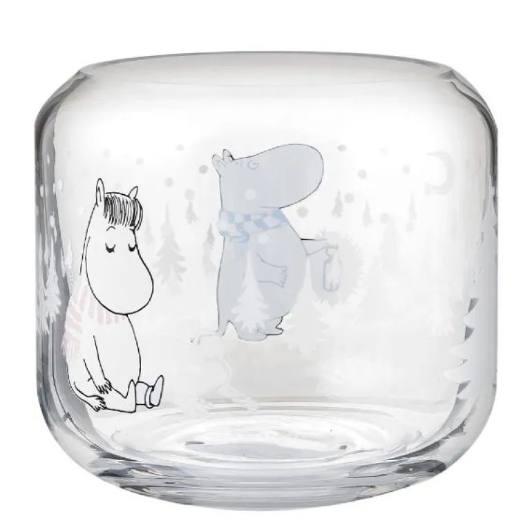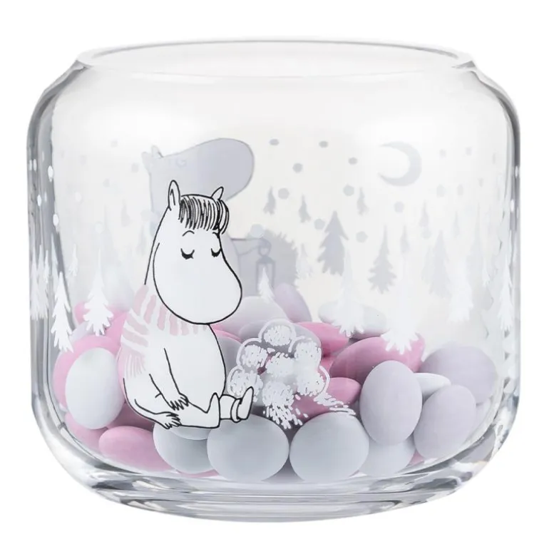 Telysestake i pastell farger med Mummitrollet og Snorkfrøken i en skog full av juletrær. Den kan også kan brukes som godte- eller nøtteskål.