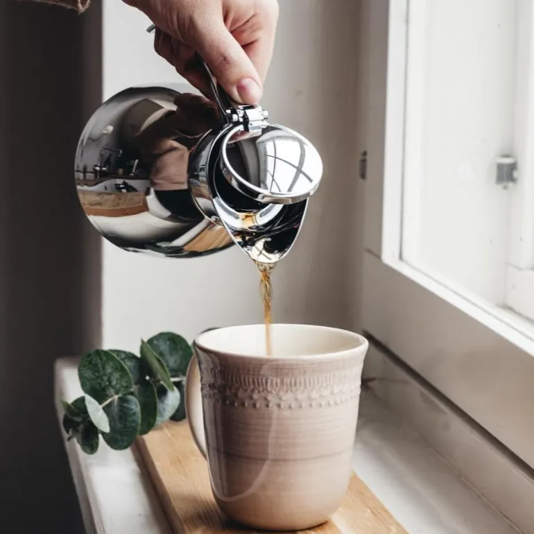 Termokanne 0,6L i rustfritt stål fra det finkse merket Heirol. Termosen kan enkelt betjenes med en hånd, og det flotte designet gjør at den gjerne får stå fremme på kaffebordet. Denne termosen holder drikken din kald eller varm i opptil 6 timer.