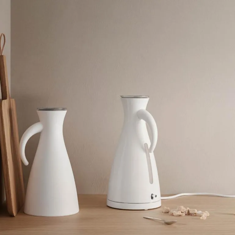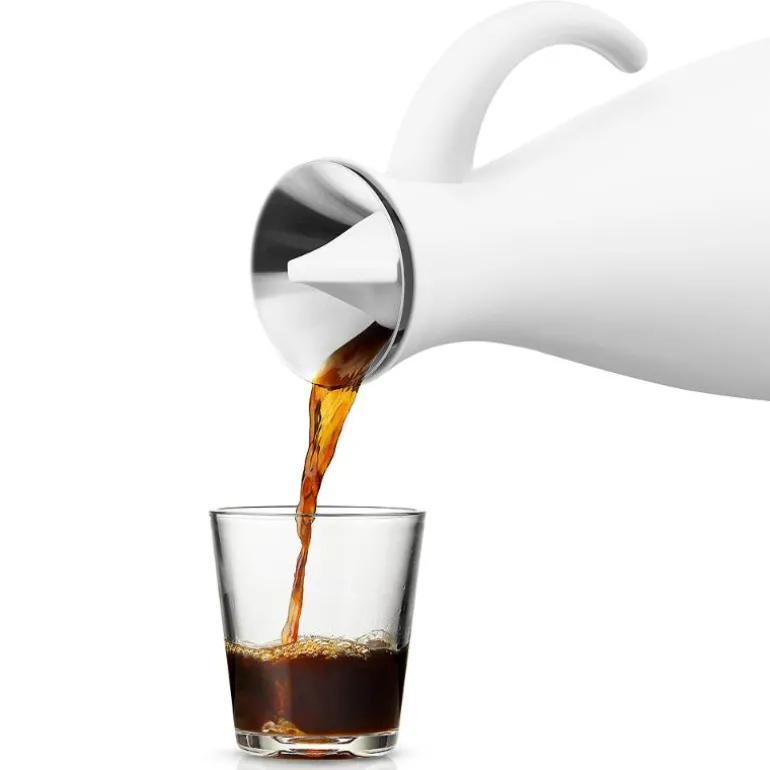 Termokannen fra Eva Solo i matt hvit er 100 % dryppfri. Den elegante termokannen har en patentert hellekant i rustfritt stål, som heller varm kaffe og te i koppen – uten å søle en dråpe.