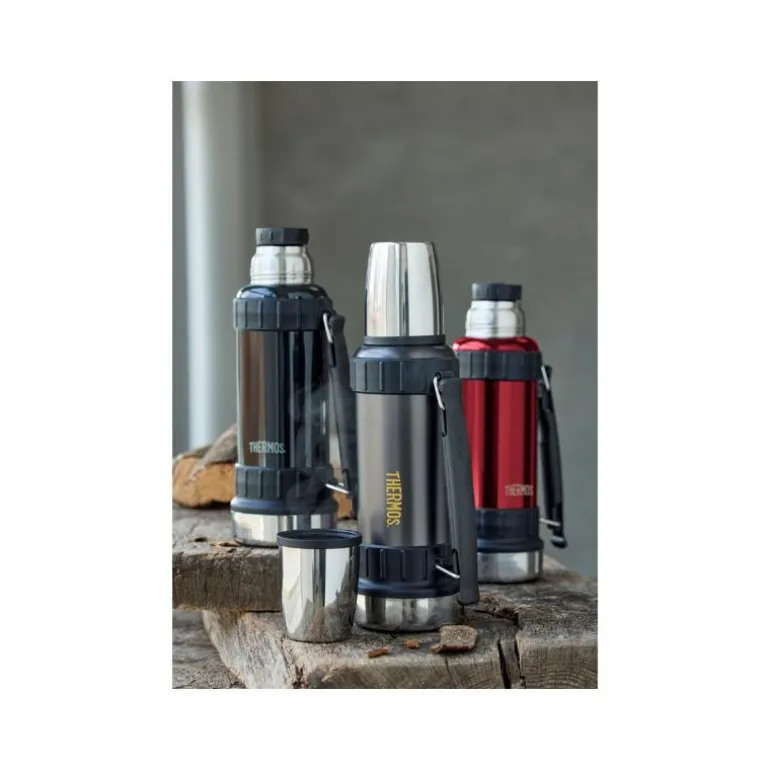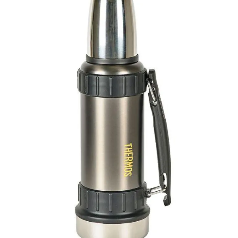Thermos 1,2 liter termoflaske i rustfritt stål. En robust termoflaske som egner seg perfekt til arbeid og lignende. Lokket kan brukes som kopp, og flasken er velegnet til både kald og varm drikke. Vi anbefaler at flasken forvarmes med varmt vann fra kranen før du fyller den med ønsket drikke. Vaskes for hånd, også før den brukes for første gang.