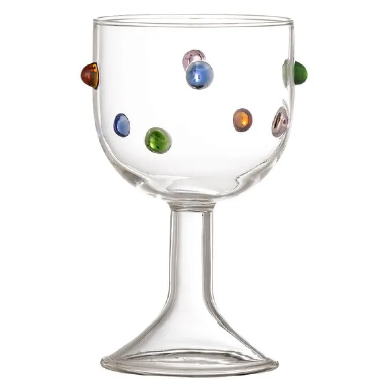 Thalia vinglass fra Bloomingville er et munnblåst vinglass med en kapasitet på 25 cl, dekorert med håndplasserte dråper av farget glass. Hver dekorasjon er laget av solid glass og påført for hånd, noe som gir hvert glass sitt eget uttrykk og gjør det til et lite kunstverk i seg selv.