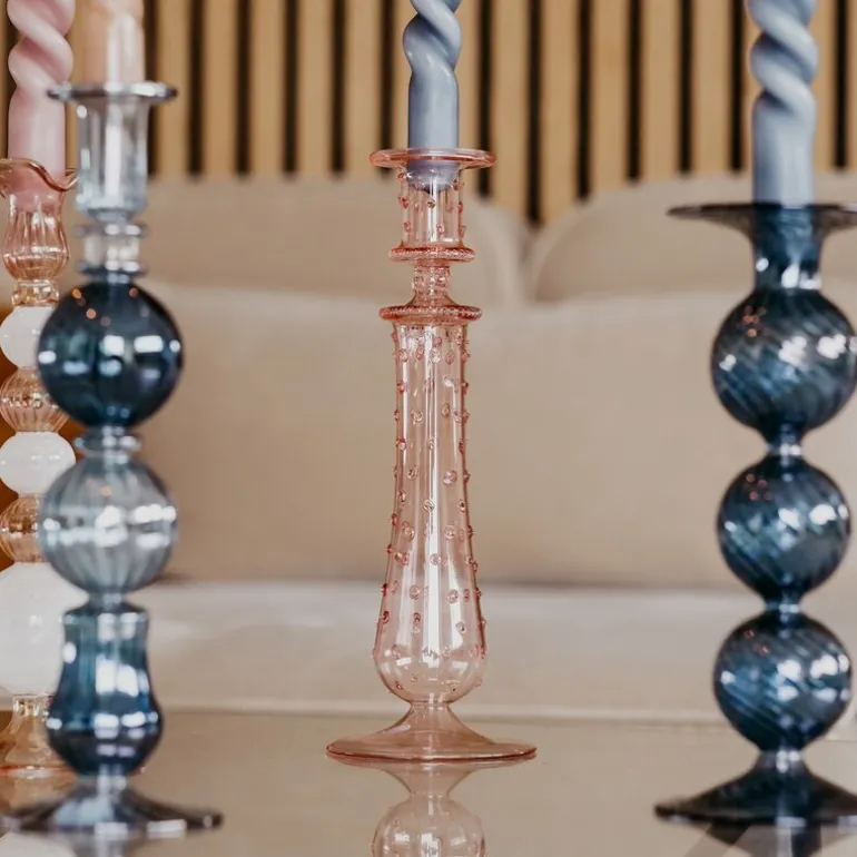 The Dots lysestake 26 cm rose fra Moonlight Copenhagen er et sjarmerende og unikt tilskudd til enhver interiørstil, perfekt for å skape stemningsfulle øyeblikk. Denne lysestaken, laget av munnblåst glass med en nydelig rosa farge, tilfører et lekent og elegant preg til hjemmet. Hvert eksemplar er 100 % håndlaget ved hjelp av spesielle teknikker, noe som betyr at små variasjoner i form og farge gjør hver lysestake helt unik. Lysestaken er designet for kronelys og kan brukes alene som et blikkfang, eller kombineres med andre lysestaker for en mer dynamisk og personlig stil. Moonlight Copenhagen legger stor vekt på kvalitet og tradisjonelt håndverk, og med The Dots lysestake får du et interiørelement som bærer preg av kjærlighet og lidenskap for detaljene. Denne vakre lysestaken skaper en innbydende atmosfære, enten den står på spisebordet, i vinduskarmen eller som en del av et dekorativt arrangement i stuen.