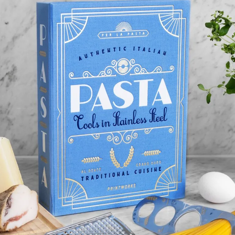 The Essentials pastasett fra Printworks. Settet leveres i en elegant boks som ser ut som en bok. Inni boksen er alle nødvendige verktøy for å lage en fantastisk pastamiddag: