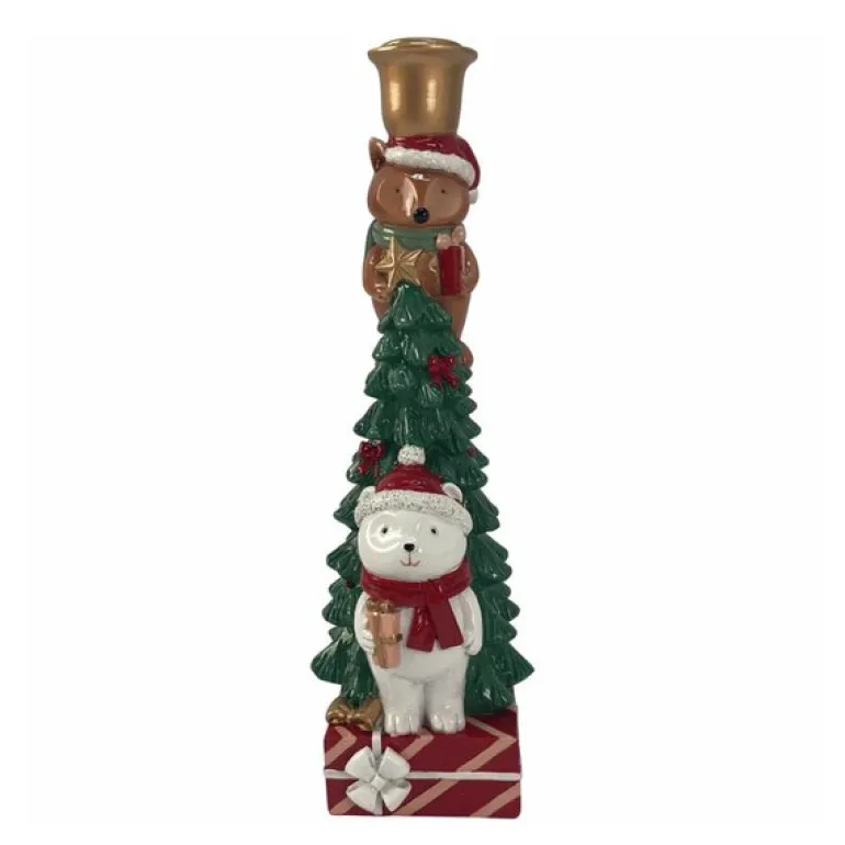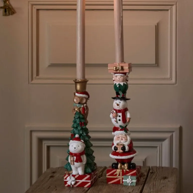 Den kombinerer tradisjonelle julefarger som grønt, rødt og hvitt med lekne detaljer som bamsefigurer og juletrær. Resultatet er en lysestake som både vekker minner og sprer glede, enten den brukes som borddekorasjon eller i vinduskarmen.