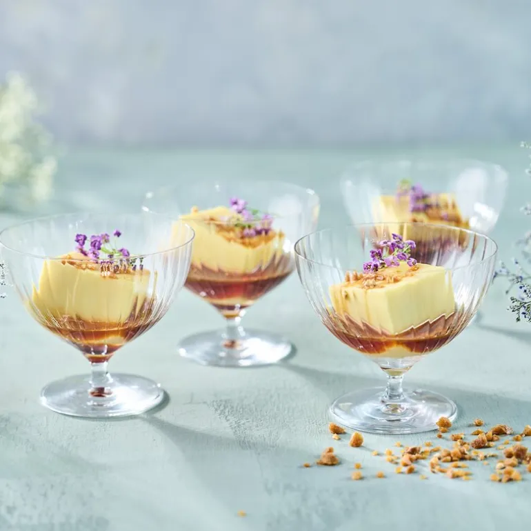 Timeless skåler på stett kombinerer klassisk eleganse med funksjonalitet, perfekte for servering av desserter og andre delikatesser. Hver rett blir en visuell nytelse når den presenteres i disse krystallklare glassene, som fremhever fargene og gjør matopplevelsen enda mer levende og forførende.