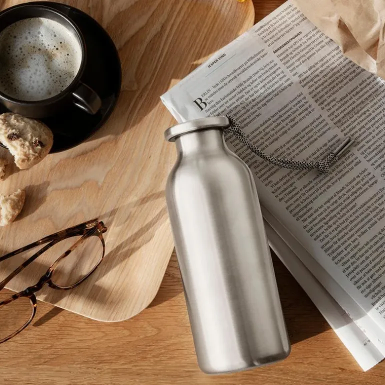 Robust termoflaske med skrulokk i stilren design. Flaskens termokonkstruksjon holder på temperaturen – kaldt i opptil 24 timer, varmt i opptil 12 timer. Skrulokket er 100 % tett, så du kan trygt ha flasken i vesken, og en integrert stropp gjør den hendig når du er på farten. Selve flasken er dessuten av rustfritt stål, som virkelig tåler slitasje og hverdagsbruk. Tåler oppvaskmaskin. Laget av rustfritt stål, plast og nylon. Mål: H: 19,5 x Ø: 7,5 cm (0,5 l.).