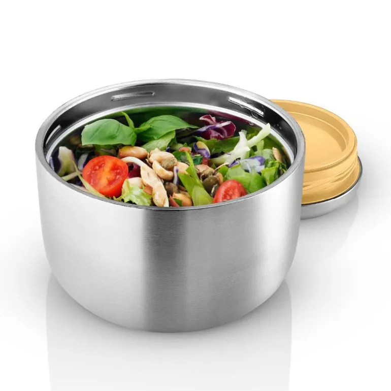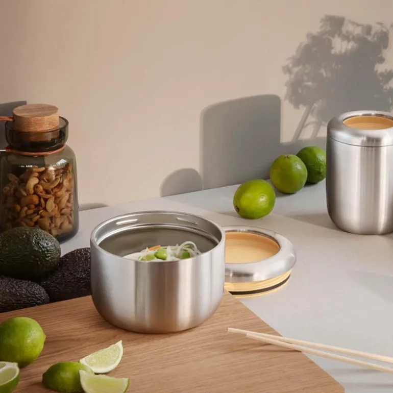 Smart termomatboks 0,71 liter i fargen Golden Sand. Matboksen er en del av To Go serien fra Eva Solo. Med en smart og praktisk To Go-boks unngår du unødig bruk av folie og engangsplast. Tar du for eksempel med deg rester fra gårsdagens middag, får du en god lunsj i tillegg til at du begrenser matsvinnet. Boksen kan selvsagt også brukes til brødskiver, salater og snacks. En innebygd ventil regulerer trykket i beholderen og gjør den lett å åpne.