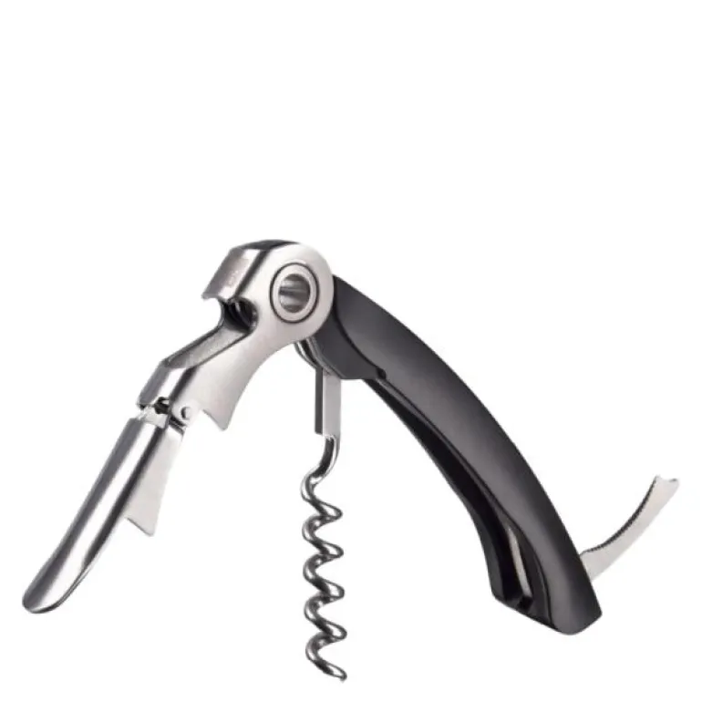 To-trinns korketrekker svart fra Vacu Vin. Den dobbelthengslede korketrekkeren bruker sin hengselmekanisme med en to-trinns bevegelse. Å åpne en flaske raskt og enkelt, på grunn av dens kompakte og lette design.