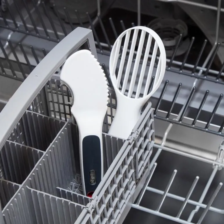 Tannet plastkant skjærer rent gjennom avokadoskallet uten å skade kjøttet inni. Metalltenner for enkel fjerning av stenen. Et must for de som elsker avokado.