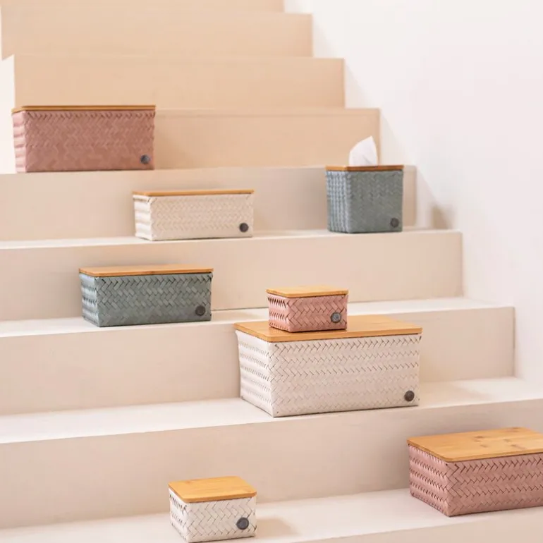 Det solide bambuslokket kombineres med en håndflettet struktur i resirkulert plast som gir varme og tekstur til interiøret. Ideell til servietter, toalettsaker eller småting i stue, kjøkken eller bad.