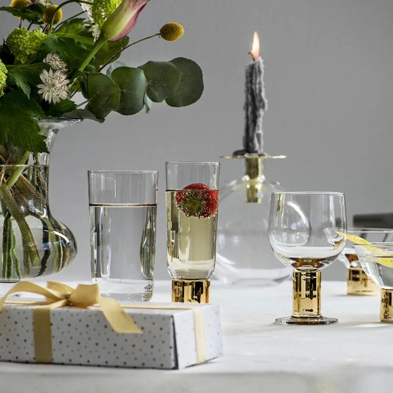 Gullfarget Top vase 18 cm, fra Sagaform, er laget av munnblåst glass og metall. En enkel, men dekorativ interiørdetalj som fungerer like godt som vase til enkle snittblomster eller som lysestake med kronlys. Metalldelen er avtagbar.