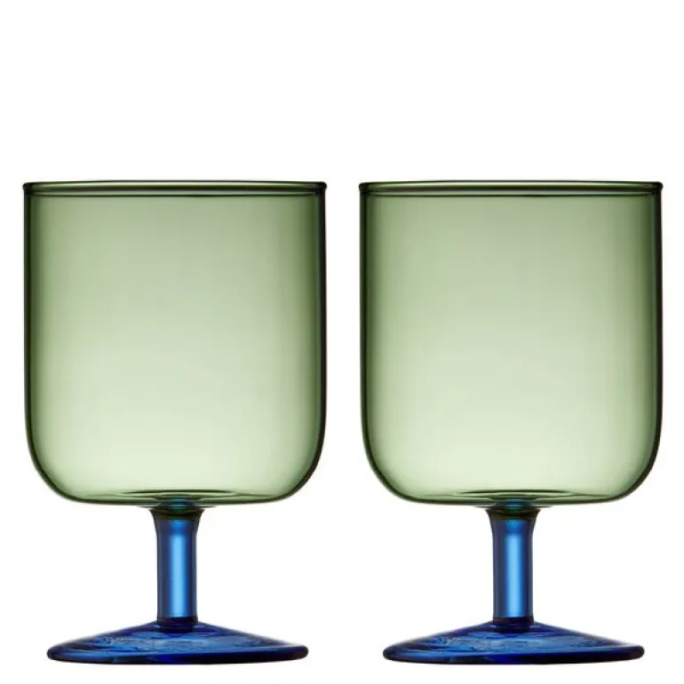 Lyngby Glas Torino vinglass i grønn/blå kommer som et sett med 2 stk glass, hver med en kapasitet på 30 cl og en høyde på 12 cm. Det gjennomfargede designet i grønn og blå nyanser gir et friskt og moderne uttrykk som passer til både hverdagsbruk og festlige anledninger. Glassene kan stables, noe som gjør dem plassbesparende i skapet.