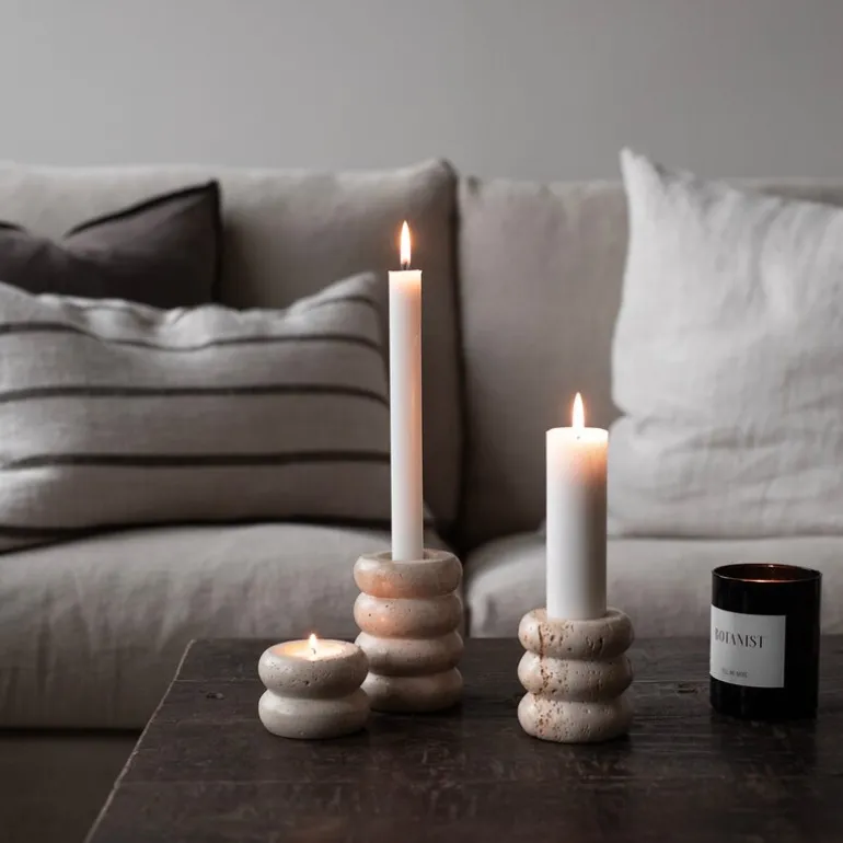Lysestaken er allsidig og passer til både kronelys med en diameter på 2,2 cm og telys med en diameter på 4 cm, noe som gjør den ideell for ulike lys. Naturmaterialet travertin er hentet fra ulike deler av kalkstein, noe som gir hver lysestake en unik karakter med små variasjoner i farge og tekstur. Dette gjør at hvert produkt får sitt eget særpreg og tilfører en personlig touch til rommet. Travertin lysestake finnes også i flere størrelser, slik at du enkelt kan skape en harmonisk og sammenhengende dekor.