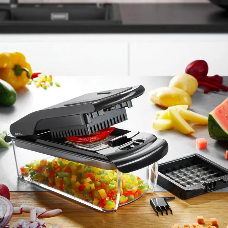 Det er ingen raskere måte å gjøre frukt og grønnsaker om til fargerike terninger og penner. Ekstra skarpe knivblad sikrer uanstrengt skjæring og rette resultater.
