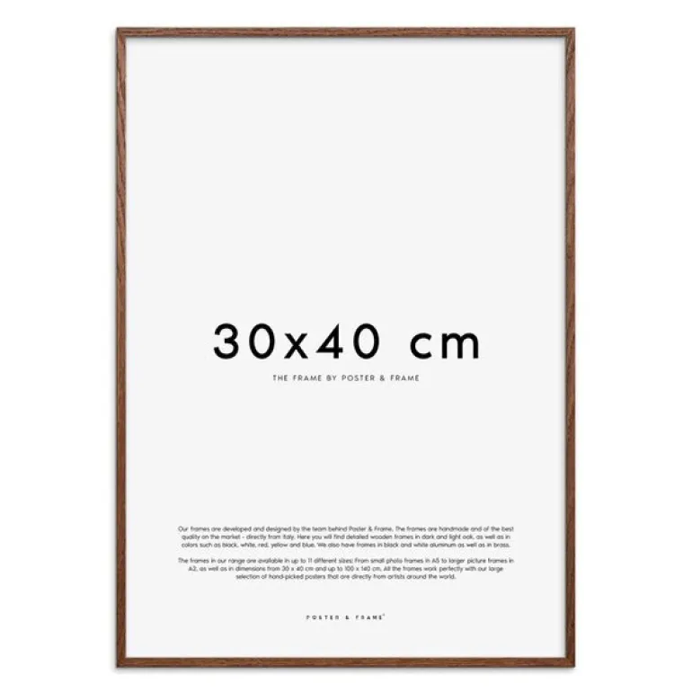 Treramme 30×40 cm mørk eik fra Poster & Frame. Kvalitetsrammer av kortreist nordisk treverk, produsert i Poster & Frame sin fabrikk i Danmark. Ved 100 % egenproduksjon, har Poster & Frame tatt full kontroll over sin egen forsynings-kjeden, og sørger dermed også for å redusere sitt klimaavtrykk.