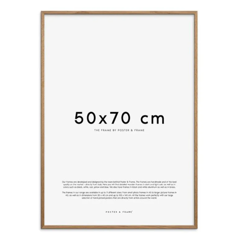 Lys eieke treramme 50×70 cm fra Poster & Frame. Kvalitetsrammer av kortreist nordisk treverk, produsert i Poster & Frame sin fabrikk i Danmark. Ved 100 % egenproduksjon, har Poster & Frame tatt full kontroll over sin egen forsynings-kjeden, og sørger dermed også for å redusere sitt klimaavtrykk.