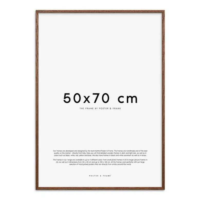 Treramme 50×70 cm i mørk eik fra Poster & Frame. Kvalitetsrammer av kortreist nordisk treverk, produsert i Poster & Frame sin fabrikk i Danmark. Ved 100 % egenproduksjon, har Poster & Frame tatt full kontroll over sin egen forsynings-kjeden, og sørger dermed også for å redusere sitt klimaavtrykk.
