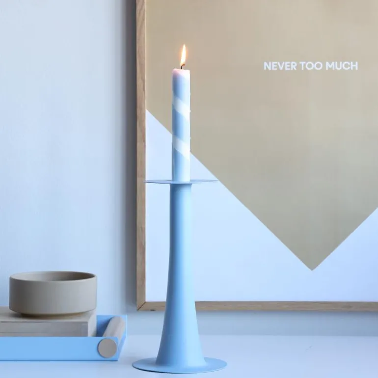 Trumpet vase/lysestake 24 cm lys blå fra Design Letters er et multifunksjonelt designobjekt som fungerer som både vase og lysestake. Bruk Trumpet som vase om våren og sommeren ved å legge til en liten bukett eller noen enkelte blomster. Snu vasen om høsten og vinteren og skap en koselig atmosfære ved å legge til et hvitt eller farget kronlys.