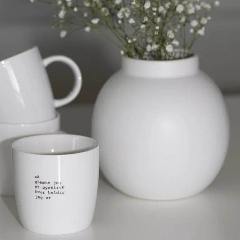 Hvitt krus med svart tekst, fra Sögne Home. Teksten på kruset er skrevet av Trygve Skaug som er låtskriver, poet og musiker.Teksten på kruset:såglemte jeget øyeblikkhvor heldigjeg erDet håndlagde sögne kruset så dagens lys i 2013, og har med sitt tynne porselen og gode hank, blitt manges favoritt! Vår samling av krus kommer i ulike farger, størrelser og utvalgte populære tekster. Sögne sine krus er blitt folkekjære favoritter som vi er stolte av! Krusene er med sitt tidløse design laget for å vare i generasjoner og fylle din dag med et treffende hverdags budskap. Krusene er hyggelig å bruke der du er med familie, venner, kollegaer og som gave for ulike anledninger.
