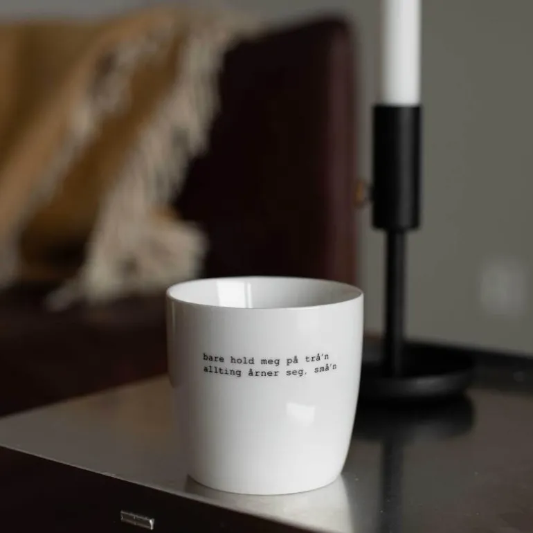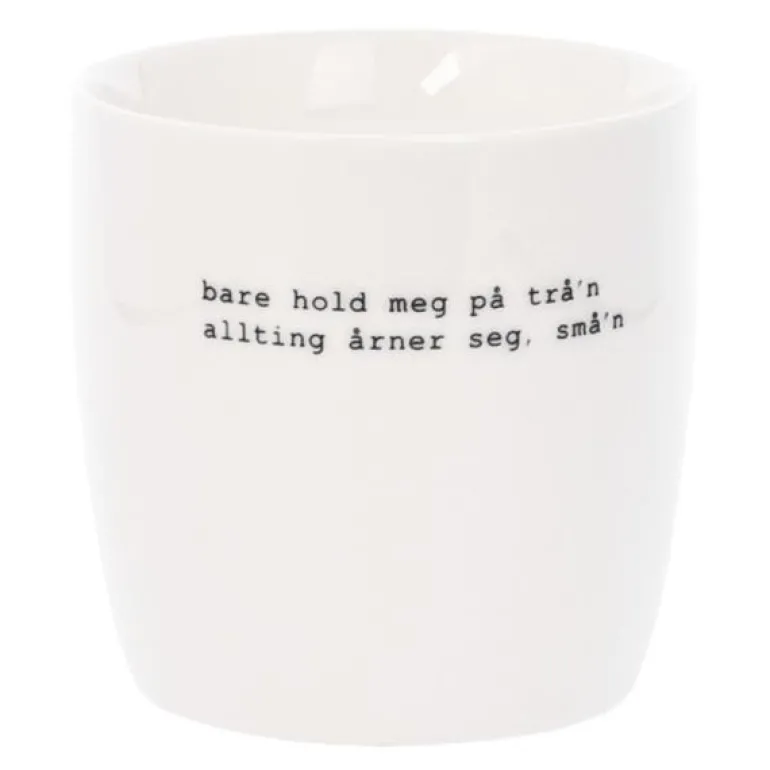 Hvitt krus med svart tekst, fra Sögne Home. Teksten på kruset er skrevet av Trygve Skaug som er låtskriver, poet og musiker.Teksten på kruset:bare hold meg på trå’n allting arner seg, små’nDet håndlagde sögne kruset så dagens lys i 2013, og har med sitt tynne porselen og gode hank, blitt manges favoritt! Vår samling av krus kommer i ulike farger, størrelser og utvalgte populære tekster. Sögne sine krus er blitt folkekjære favoritter som vi er stolte av! Krusene er med sitt tidløse design laget for å vare i generasjoner og fylle din dag med et treffende hverdags budskap. Krusene er hyggelig å bruke der du er med familie, venner, kollegaer og som gave for ulike anledninger.