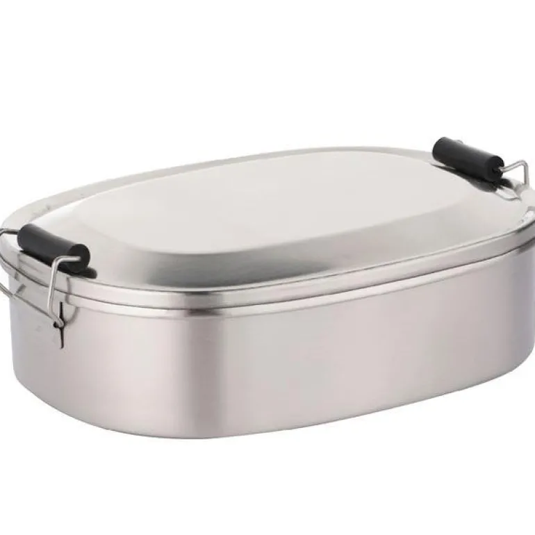 Klassisk matboks i 18/8 stål med klemme-lukking til skole, jobb og turopplevelser. Ved å oppbevare maten i en lunsjboks, er du med på å redusere forbruk av engangsmateriell.