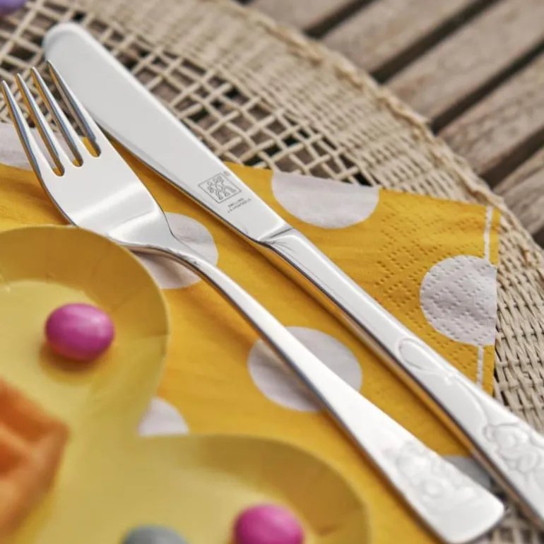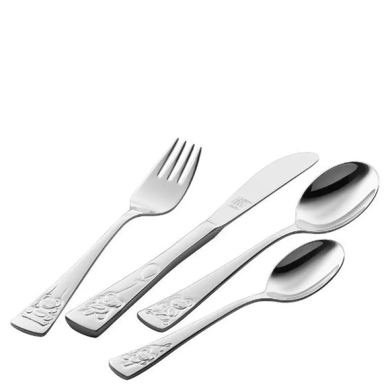 Barnebestikk Twin Kids Teddy fra Zwilling. Et lekent bestikksett for barn, med morsomme motiver av ulike teddybjørner, som sprer godt humør rundt bordet. Alt bestikk er laget av 18/10 rustfritt stål og er spesialdesignet for barnehender. Barnevennlig design med stump kniv og avrundede gaffelspisser.
