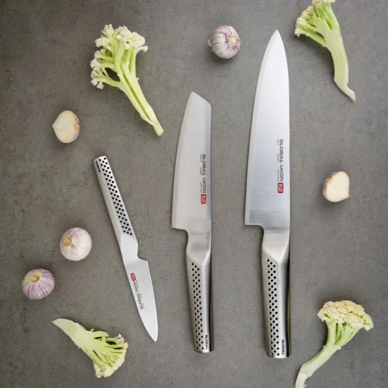 Global Ukon knivsett 3-deler er laget av høykvalitets rustfritt stål og har tykkere blader for forbedret ytelse. Knivene er designet med tommelstøtte for bedre kontroll og effektivitet. Med en skarphet på 15 grader og ergonomisk håndtak som passer for både høyre- og venstrehendte, vil disse knivene gjøre matlagingen til en glede.