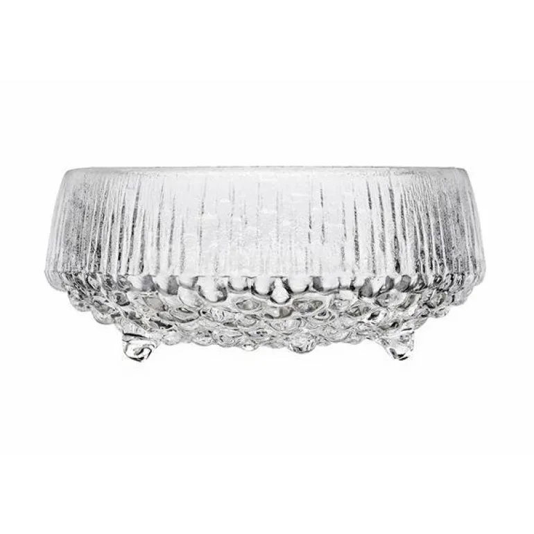 Ultima Thule skål 115mm klar 2-pk. Design Tapio Wirkkala 1968. Smeltende is i Lappland var Tapio Wirkkalas inspirasjon da Ultima Thule ble til, men overflaten på Ultima Thule ble opprinnelig skapt da Wirkkala på 1960-tallet eksperimenterte med å helle glødende glassmasse i grafiske treformer han hadde skåret i. Mønsteret ble gradvis endret ettersom glasset brant seg inn i overflaten på treformene. Det eksklusive designet gjenspeiler de tusentals timer som har blitt brukt for å finjustere glassblåseteknikken, som kreves for å produsere effekten i glasset. Den klare Ultima Thule-skålen er fantastisk til servering av nøtter, godteri, krydder eller desserter. Flott gave.Kan vaskes i oppvaskmaskin.